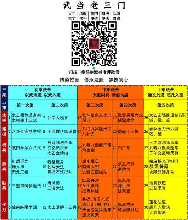 武當,以武入道,以武築基練己見性以磨礪心性,苦其心誌而入仙道預備考證期,有“以武而擋天下欲求道者”之意。然而,武當是當而非擋,擋,不是目的,是觀求道者擔當,觀其是否有可繼往聖絕學之決心與擔當。仙與道遠,武與世近。武當,即太上立法,祖師以武擔當其傳,立以武入道之梯。明代三豐祖師曰,武當派“異日必大興”後!隨時代變遷,武當各派武顯而道隱古傳之門漸漸隱沒,遂將古傳最具代表性之太乙、清虛、天罡、龍門四門,合稱為武當老四門。四門雖門戶不同,但皆為武當派以武入道之仙學道脈,一理貫之。